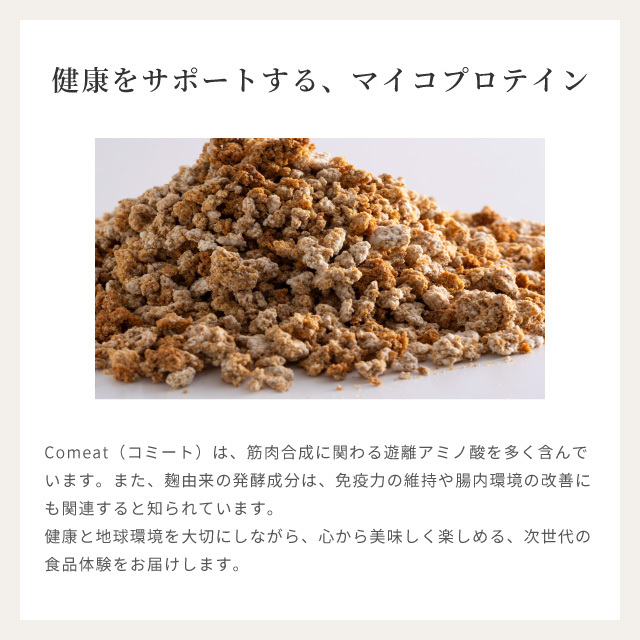 国産米の糖質を除いたお米のたんぱく質を麹菌で発酵させて生まれた発酵たんぱく素材「Comeat」を使用。大豆ミートとはまた違った、米由来ならではのクセの少ない味わいと、素材本来の旨み、ほぐれるような食感を楽しめます。